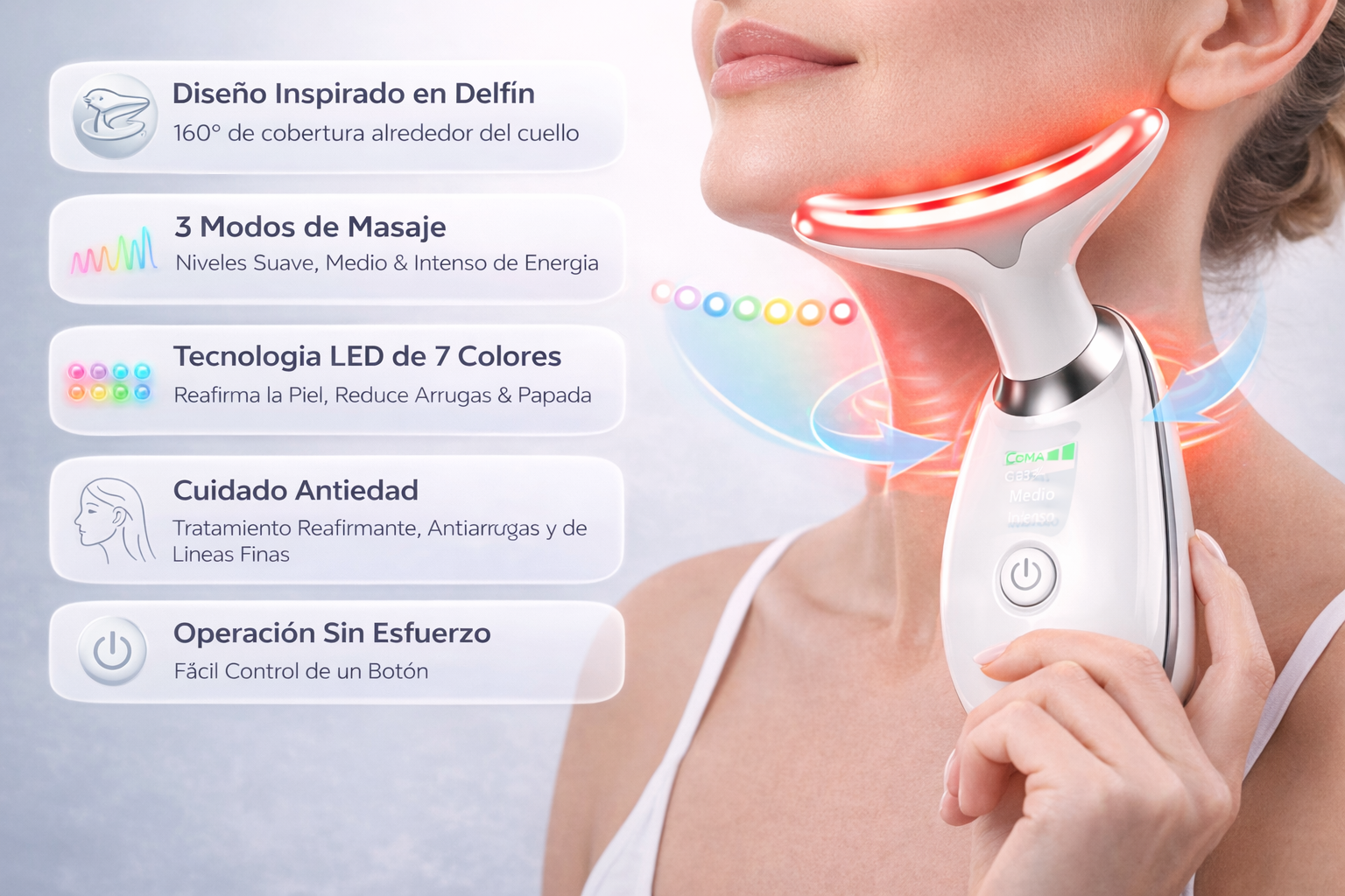- 🌈 Tecnología LED de 7 colores que ayuda a reafirmar la piel, reducir arrugas y papada, y potenciar el efecto antienvejecimiento.